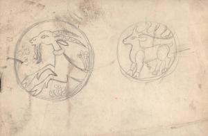 (76) untitled [sketch, goat and deer [studies for design elements, animal, two figures in circles, goat (left), deer (right)]