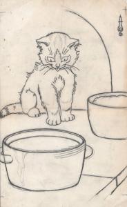 (119) untitled [sketch, kitten looking at a pot of food]