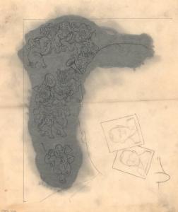 (126) untitled [sketch, an all elephant marching band with a silhouette drawing of head and two small framed pictures of men]