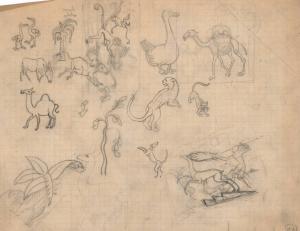 (137) untitled [various sketches of animals (monkeys, donkeys, camels, birds, cats, etc…)]