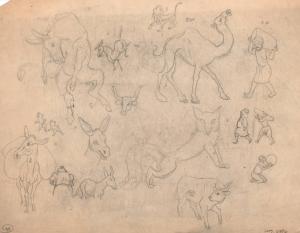 (139) untitled [various sketches, several donkeys, a camel, ox, fox, lion, people, and dogs]
