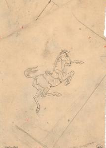 (142) untitled [sketch; old boney horse, wearing saddle, trotting]