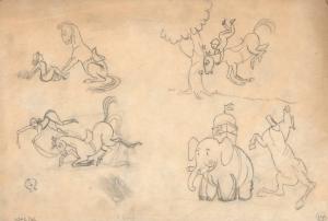 (144) untitled [sketches; three scenes of a horse and female rider having various accidents, and other sketches]