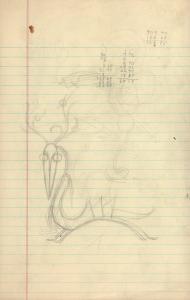 (158) untitled [sketch, creature with antlers, beak shaped head, spiny back]
