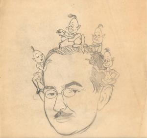 (165) untitled [self-portrait of Boris Artzybasheff with Gremlins on his head]