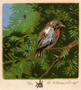 [Robin on an evergreen branch with remarque of a beetle]