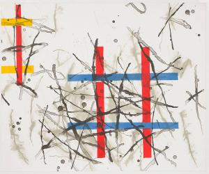 [Grouped primary color geometric shapes, “#” shape in red and blue on white field with black marks]