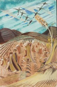untitled [wheat field - migrating ducks/geese flying in "V" formation in sky