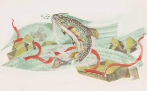 untitled ["Rainbow" trout swimming in green waves, rocks, and red ribbon wave]