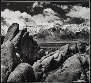[Mountainous landscape with boulders in the foreground]