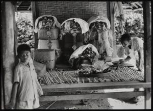 Bali - Sanur. Dance ceremonial masks, covered with white cloth while in the temple area