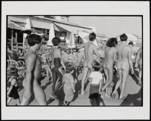 Family walking down pathway in nudist village, Cote d'Azur, France