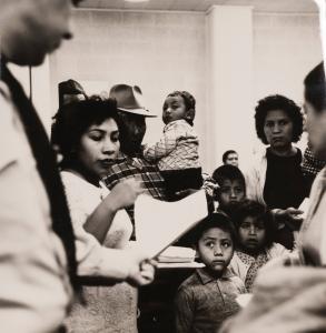 - Immigration from Mexico to the USA: all people who come from Mexico and do not yet have a health pass must first of all go to the sanitary control waiting room. Hundreds of people are waiting there every day - on some days their number is in the thousands - for medical check-ups. Those who come to USA for a short visit as tourists are quickly cleared, while seasonal workers and immigrants, on the other hand, often have to spend a whole day here and subject themselves to strict tests. Children's health is also strictly examined. Off camera two men, who are experts from the Ministry of Health of Cambodia, are studying the methods of quarantine in El Paso, Texas