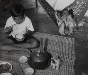 Boy having a meal with baby in a hammock next to him, Vietnam