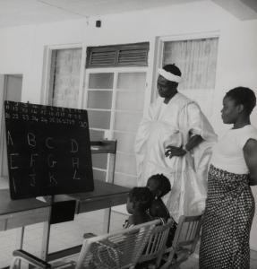 Family at home teaching their children the alphabet, likely Dakar, Senegal, Africa