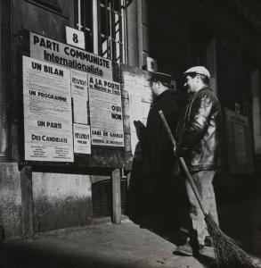The police officer and sweeper are reading the posters of the International Communist Party, Paris, France/ Voter in front of an election propaganda billboard for the "Parti Communiste Internationaliste"/ Elections to the Constituent National Assembly and Referendum (rejection of a first draft constitution), Paris, France, October 21, 1945
