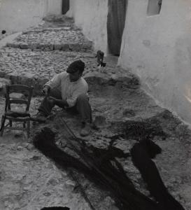 Fisherman mending his nets, Ibiza, Balearic Islands, Spain August 1955