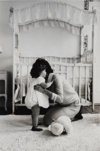 Jackie Kennedy hugging daughter Caroline in their Georgetown home nursery