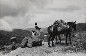 Mules and people resting on the road from Port-au-Prince inland to Kenscoff, some 5,000 feet above sea-level, provide a typical Haitian scene with a magnificent backdrop of clouds and mountains, Haiti