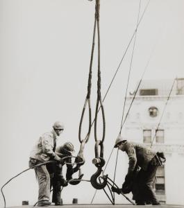 Three construction workers tying ropes on crane hooks