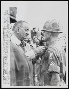 President Johnson pins the Distinguished Service Cross on Sergeant Charles B. Morris, of Galax, Virginia during ceremonies here October 26th, 1966, when Johnson paid an unannounced visit to Vietnam