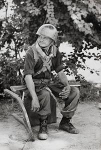 The Struggle For Cambodia: Portrait of a Cambodian soldier; old before his time he sits slumped in a posture of abject dejection; he has witnessed the utter devastation of his country