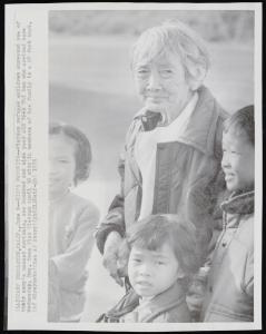 - Kid’s Favorite: Vietnam refugee children surround one of their camp’s newest arrivals, one-hundred-and-nine-year-old Tran Thi Nam who arrived here Wednesday. Mrs. Tran fled Vietnam on April 30th with 14 members of her family in a 20 foot boat, Camp Pendleton, California, June 6, 1975