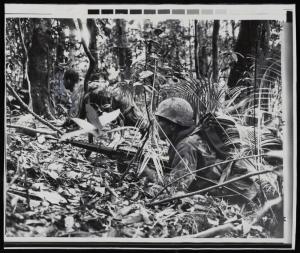A U.S. Marine loses his helmet as he ducks behind a tree as a second marine hugs the ground, his M16 rifle alert, after being fired upon by an undetermined number of North Vietnamese soldiers in the jungle southwest of Da Nang, South Vietnam, the action took place near an enemy regimental base camp on April 22, 1969