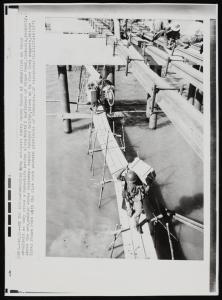 Cambodian Army soldiers carry heavy boxes of ammunition on their shoulders as they cross a makeshift bridge along route 5 northwest of Phnom Penh, Cambodia January 2nd, 1972. Above the men public works engineers repair damaged bridge, blow up by Viet Cong sappers. The span links Phnom Penh with the rice-rich western provinces of Cambodia