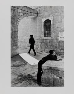 - The Purim Festival: boy leans on wall in the Mea Shearim Orthodox quarter of the city, Jerusalem, 1967