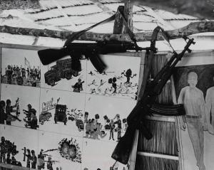 Guns hang in front of drawings of war scenes, Cambodia, c. 1980