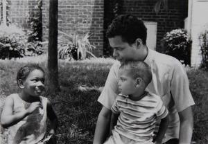 Julian Bond sits with children in front yard, Detroit, July 1969