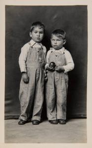 [Two standing boys in denim overalls, one holding an apple]
