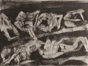 Figures in tormenting rain