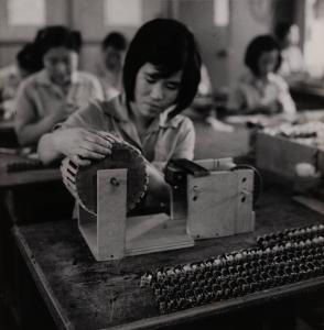 [Female workers at their stations in a factory]