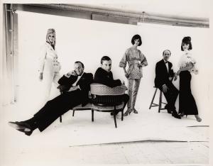 [Bill Blass, John Weitz, and John Moore seated with models standing by]