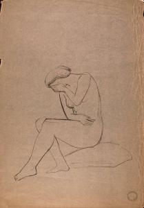 [Seated nude woman with left hand covering face]