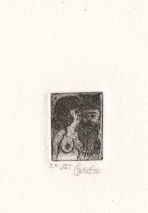 [Nude woman with bearded man wearing hat]