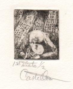 Untitled, distorted figure, heads kissing, buildings in background